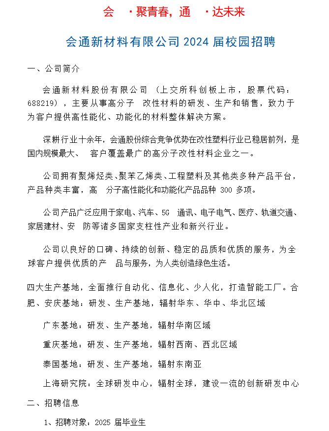 【招聘簡章】會·聚青春,通·達未來 會通新材料有限公司2024屆校園招聘
