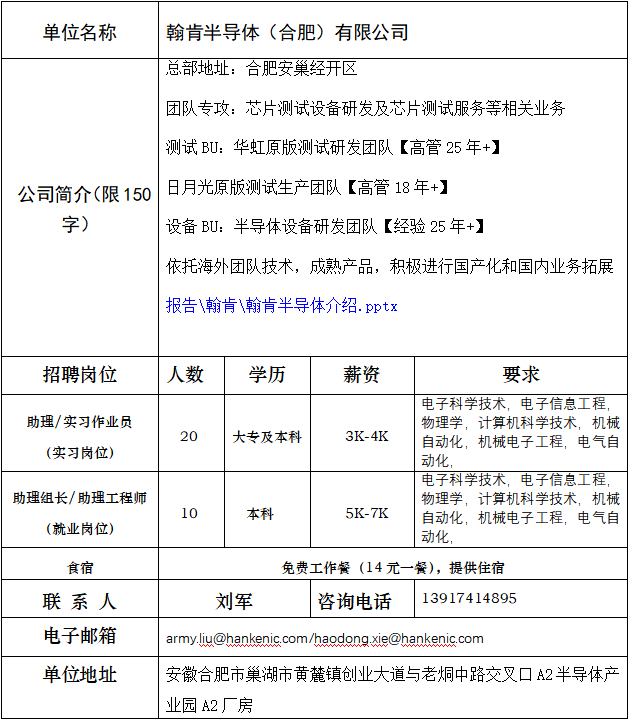 【招聘簡章】翰肯半導體(合肥)有限公司