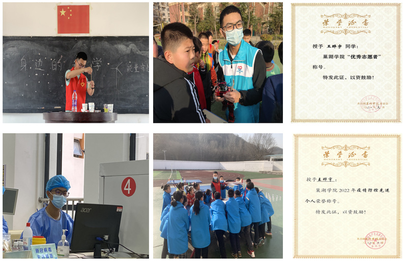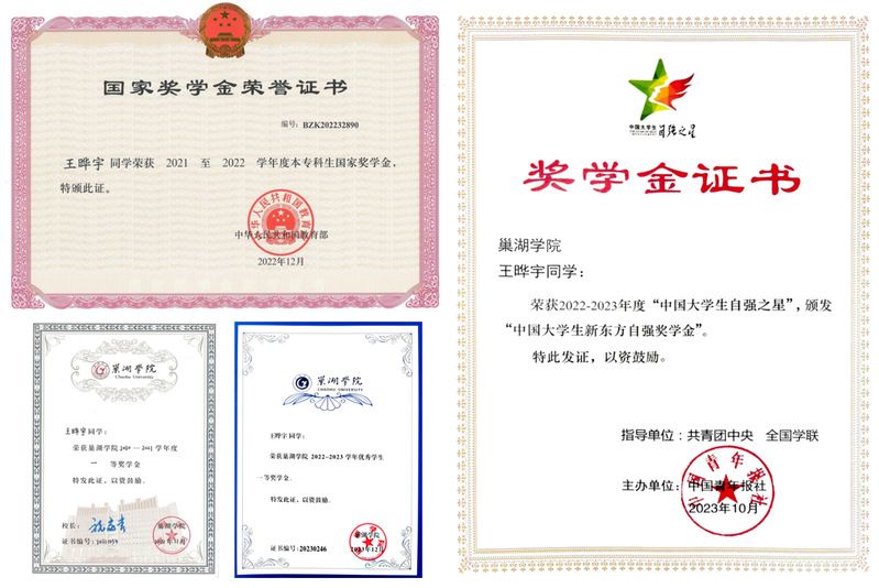 在校期間,王曄宇任班級班長,輔導(dǎo)員助理,航模協(xié)會副會長,巢湖學(xué)院學(xué)工部就業(yè)指導(dǎo)中心“就業(yè)大使”等職務(wù)。他榮獲2021-2022學(xué)年度本科生國家獎學(xué)金、2022-2023年度中國大學(xué)生自強(qiáng)之星獎學(xué)金等獎項(xiàng),擔(dān)任2024-2025學(xué)年校研究生會學(xué)生干部。