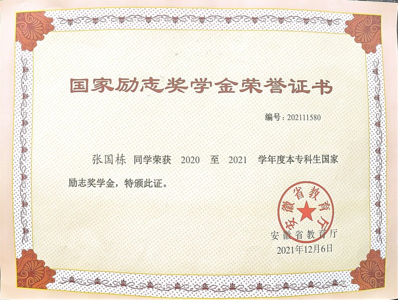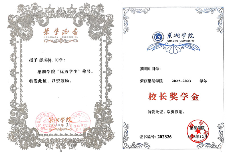 在校期間,積極參加學校舉辦的各類活動,曾獲2021年國家勵志獎學金,2022年國家勵志獎學金,2023年校長獎學金;榮獲“優秀學生”“優秀共青團員”、2024屆“安徽省普通高等學校優秀畢業生”等榮譽稱號。撰寫發明專利1項,發表學術論文3篇、主持省級大學生創新創業項目1項,作為項目成員參與國家級大創項目1項、安徽省級大創項目1項,參與皖維科技孵化基金項目2項。