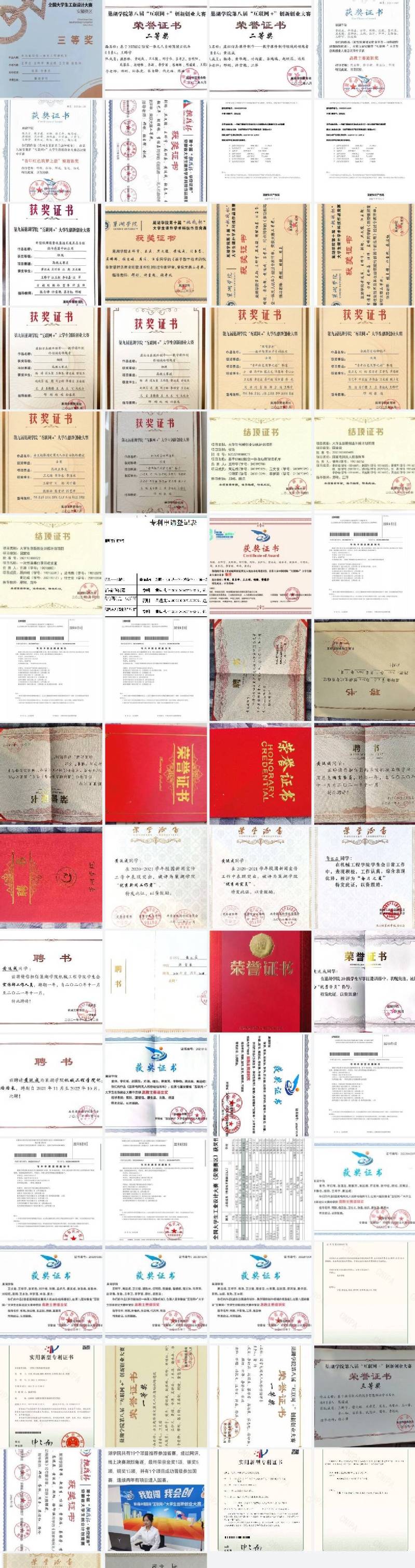 黃運成積極參加各類學科競賽。2021年參加第七屆“互聯網+”全國大學生創新創業大賽中獲得安徽省金獎、第八屆“互聯網+”大賽中獲得國家級銅獎,省級金獎、銀獎、銅獎各項,第九屆“互聯網+”大賽中獲得安徽省銀獎、銅獎各項;參加安徽省“挑戰杯”大挑小挑獲得二等獎三等獎數項;參加安徽省工業設計大賽獲得三等獎等;獲批實用新型專利2項;獲批大學生創新創業國家級項目三項(兩項已結項)省級項目兩項(一項已結項);校級獎項30余項。