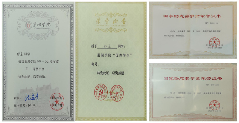 邱樂,男,漢族,2002年3月24日出生,中共黨員,巢湖學院機械工程學院2020級機械設計制造及其自動化專業學生,在班級擔任網絡委員和宣傳委員。在校期間,他積極參加各類社會實踐和志愿服務活動,同時他的學習成績優異,曾獲校級三等獎學金、兩次國家勵志獎學金。榮獲校級“優秀學生”等榮譽稱號。在2024年的研究生入學考試中成功考入溫州大學機械專碩。