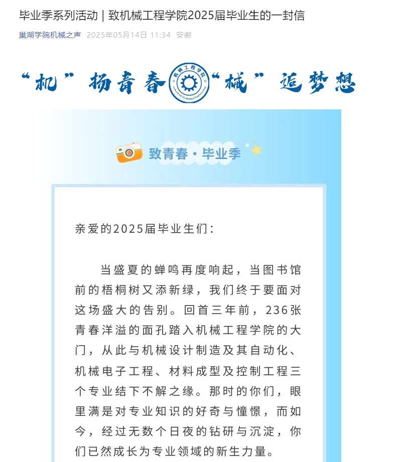 拍攝一部祝福視頻。學院依托“機械之聲”易班中心,制作了《械逅時光 青春再見》祝福視頻。視頻回顧了2025屆畢業生大學四年的美好時光,并送上學院領導、老師和學弟學妹們的真誠祝福。