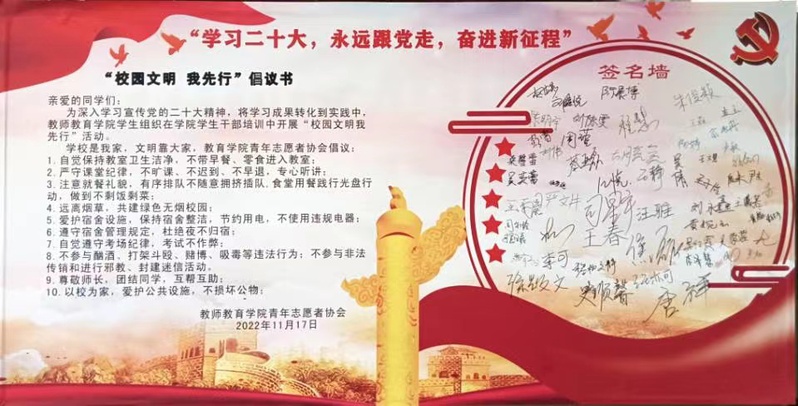 為深入學習宣傳貫徹黨的二十大精神,將學習成果轉化為實際行動,11月17日下午,教師教育學院發起“校園文明 我先行”倡議活動。教師教育學院2022年學生干部培訓班全體成員參加。