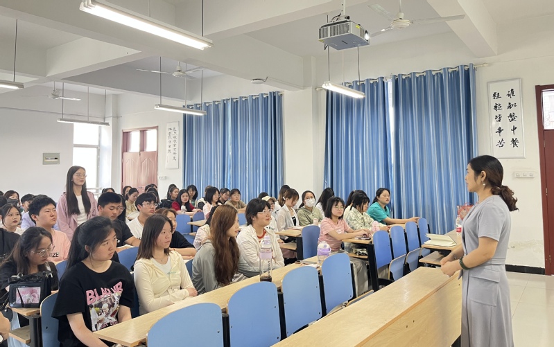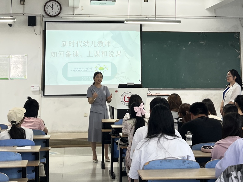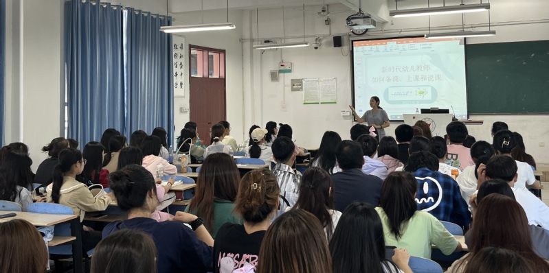 為提升學(xué)生幼兒教師職業(yè)口語(yǔ)的實(shí)踐運(yùn)用能力,加強(qiáng)與實(shí)踐基地的交流,切實(shí)提高協(xié)同育人水平,2023年6月9日下午,教師教育學(xué)院學(xué)前教育專(zhuān)業(yè)師生在慎思樓北201開(kāi)展了”園長(zhǎng)進(jìn)課程進(jìn)課堂”活動(dòng),巢湖中心幼兒園園長(zhǎng)於婷婷走進(jìn)專(zhuān)業(yè)課堂,為2022級(jí)學(xué)前教育專(zhuān)業(yè)近百名學(xué)生,帶來(lái)一場(chǎng)題為“新時(shí)代幼兒教師如何備課、上課和說(shuō)課”的講座,活動(dòng)由《幼兒教師口語(yǔ)》課程教師袁鳳琴主持。