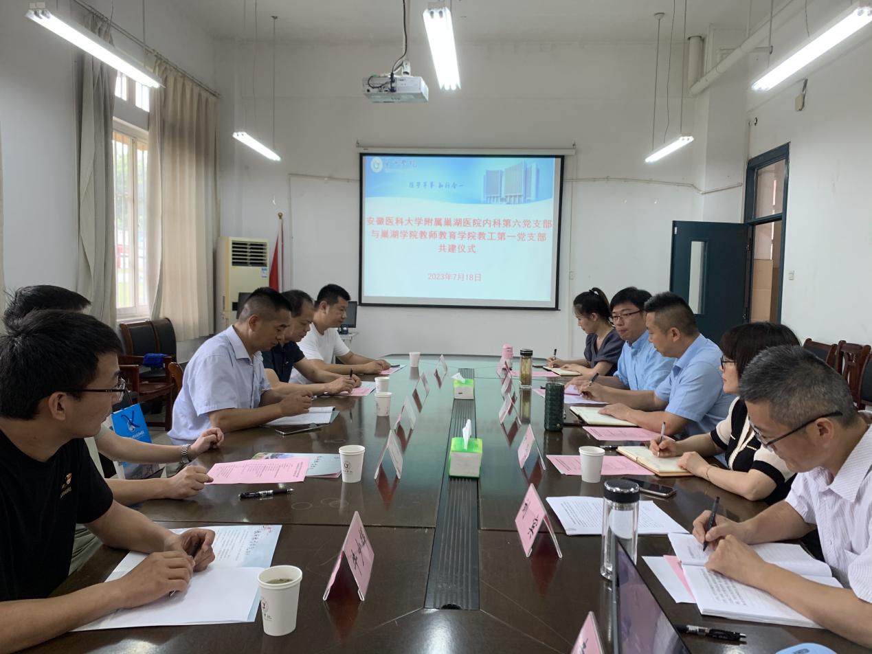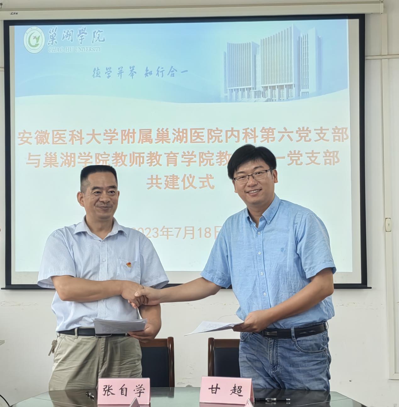 結(jié)對共建聚合力,黨建引領(lǐng)促發(fā)展。7月18日上午10時(shí),教師教育學(xué)院教工第一黨支部與安徽醫(yī)科大學(xué)附屬巢湖醫(yī)院內(nèi)科第六黨支部結(jié)對共建簽約儀式在藝術(shù)樓會(huì)議室順利舉行。本次活動(dòng)由教師教育學(xué)院教工第一黨支部書記甘超主持,安徽醫(yī)科大學(xué)附屬巢湖醫(yī)院內(nèi)科第六黨支部張自學(xué)一行5人、教師教育學(xué)院教工第一黨支部支委會(huì)全體委員參會(huì),教師教育學(xué)院副院長蔡廣作為普通黨員出席了儀式。
