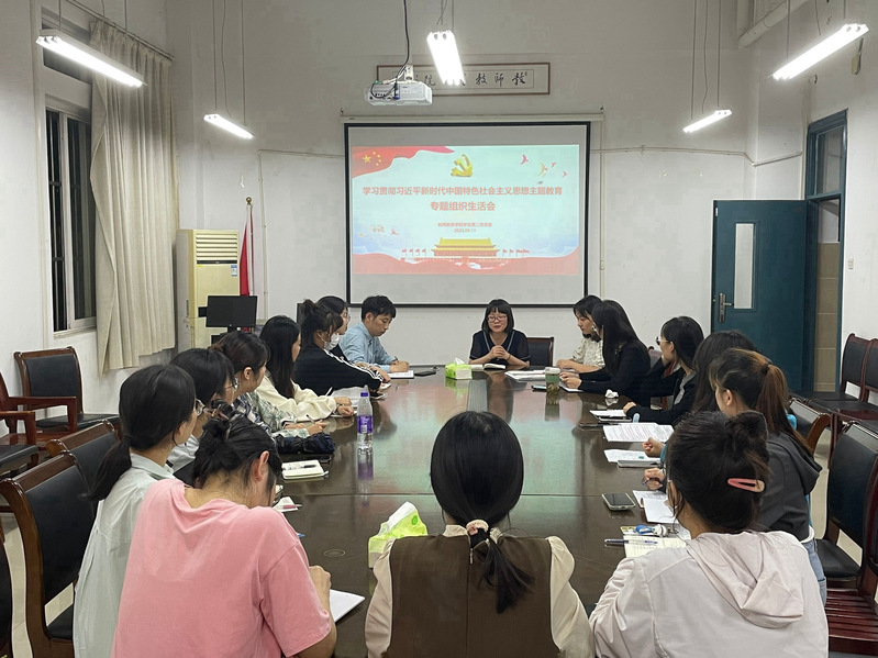9月13日晚7:00,教師教育學院學生第二黨支部在藝術樓黨員活動室召開學習貫徹習近平新時代中國特色社會主義思想主題教育專題組織生活會。會議由支部書記湯重主持,教師教育學院副院長鄭艷到會指導。