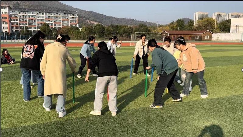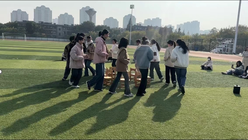 2021級學前教育專業學生在第二運動場,擬大班幼兒為對象,以促進幼兒“大肌肉動作與協調性發展”“體能發展”“團結協作能力提升”“提高社會交往能力”“積極愉悅的情緒體驗”等為目標,開展了一場戶外游戲活動的設計改良體驗,游戲有“手忙腳亂”“一元五毛”“不倒森林”“袋鼠跳”“踩氣球”“墊腳傳遞”等,活動開展過程中,同學們將本學期在幼兒園見習中的所獲所得,以項目驅動式,小組為單位,討論與交流設計游戲活動,并將其投入于實踐環節,做到了全員參與設計、全員體驗游戲活動。活動結束后,學生回歸課堂,即時反饋實踐活動從游戲設計、游戲組織、游戲材料準備再到游戲開展效果等內容中的經驗與不足,進一步聯結了理論與實踐之間的橋梁。