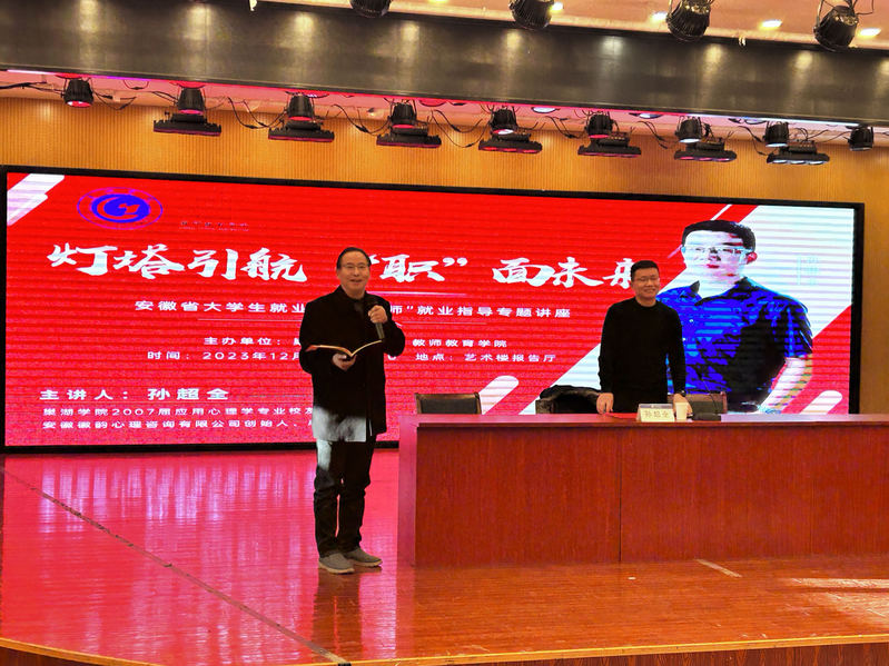 為深入貫徹黨的二十大精神和黨中央、國務院關于高校畢業生就業工作的決策部署,提升學生就業創業意識和能力,促進畢業生高質量充分就業,12月7日下午,校團委、教師教育學院在藝術樓報告廳舉辦大學生就業指導專題講座。安徽省大學生就業“引航導師”、安徽徽韻心理咨詢有限公司創始人、總經理孫超全主講,全校200余名學生現場聆聽講座?;顒佑山處熃逃龑W院黨委副書記左勁中主持。