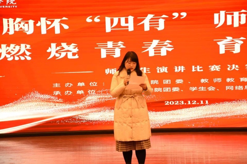經個人報名、學院推薦、初賽,共有10位選手進入決賽。比賽現場,選手們緊扣“胸懷‘四有’ 師道圓神,燃燒青春 育人方智”主題,結合新時代師德楷模的先進事跡和身邊優秀教師的感人故事,講述了對教師職業的深刻理解,抒發了對恩師的感激之情,從不同維度詮釋了心目中“四有”好老師的鮮活形象。選手們的演講立場鮮明、聲情并茂、感人至深,表達了對教育事業的執著追求和無限熱愛,充分展現了新時代大學生積極向上、奮發有為的精神風貌,贏得了評委老師和現場觀眾的陣陣掌聲。