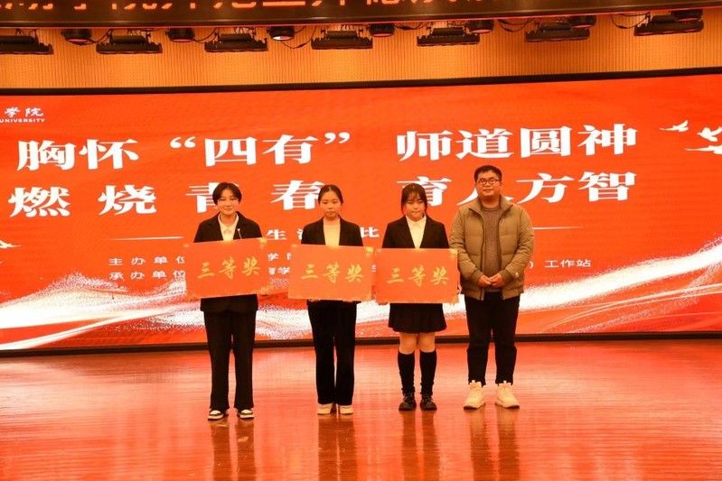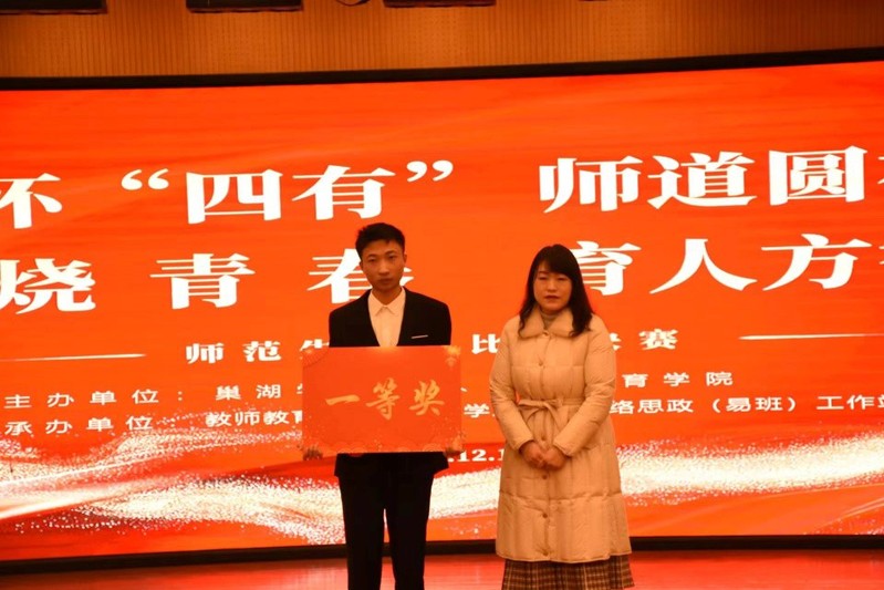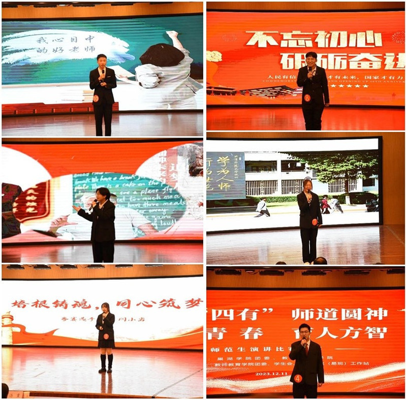 為深入學習宣傳貫徹黨的二十大精神,厚植師范生“躬身教壇,強國有我”的教育情懷。2023年12月11日晚,由巢湖學院團委、教師教育學院聯合舉辦的師范生師德演講比賽決賽在藝術樓報告廳舉行。本次比賽由教師教育學院黨委副書記左勁中、校團委兼職副書記吳娜、校團委兼職副書記王雅琴、外國語學院團委書記余仁能、教師教育學院團委副書記湯重擔任評委。