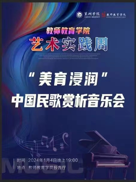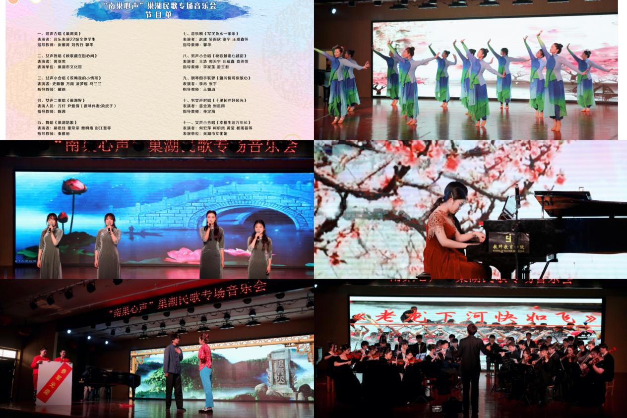 “唱山唱水唱風情,傳音傳藝詠流傳!民歌唱響湯山,民歌唱出民心!”為深入貫徹黨的二十大精神,保護并傳承非物質文化遺產。2023年12月28日下午,由巢湖學院和巢湖市文化和旅游局主辦,巢湖學院教師教育學院承辦的“南巢心聲”巢湖民歌專場音樂會,在藝術學院二樓多功能廳舉辦。