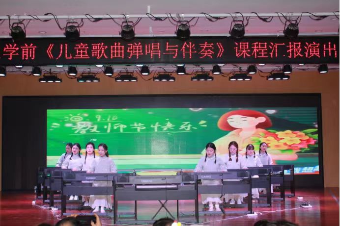 為貫徹落實黨的二十大精神和“立德樹人”根本任務,進一步推深做實OBE教學理念,強化同學們自主實踐體驗并檢視提升專業水平與實踐能力,豐富校園生活,營造良好的專業學習氛圍。2023年12月27日下午,2021級學前教育專業《兒童歌曲彈唱與伴奏》匯演在藝術樓報告廳成功舉辦。