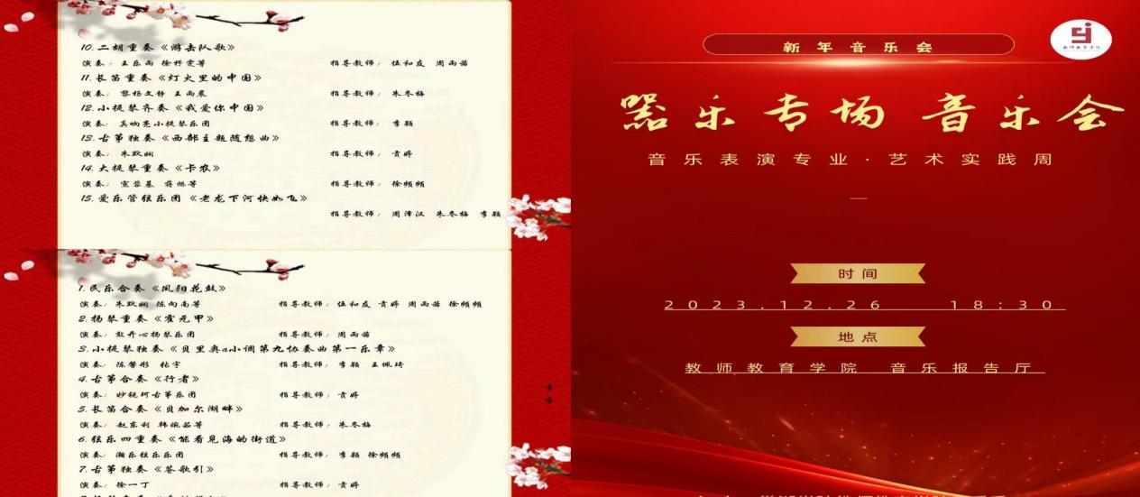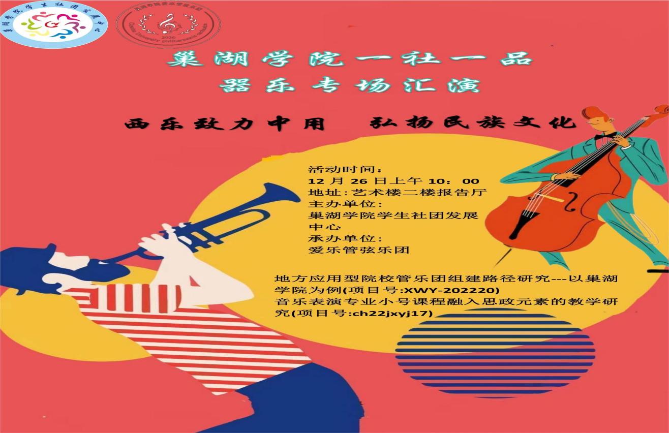 2023年12月26日上午十點,由周澤漢老師指導的巢湖學院“一社一品”器樂專場匯演在藝術樓報告廳舉行。整場演出體裁形式多樣,曲目風格多元,既有西方經典作品《康康舞曲》《波西米亞舞曲》,也有我校教師楊丹原創的四手聯彈《花開夢芳菲》、原創歌曲《七月的太陽》改編的管弦樂作品,周澤漢老師的管弦樂《warm up》《老龍下河快如飛》,王佩琦老師的四手聯彈《姐叫情哥你放心》,同時還有對于民族音樂和紅色歌曲的大量演繹,契合“西樂致力中用 弘揚民族文化”的主題,使演出基調多層次發展,學生在音樂表現上多方面進步。
