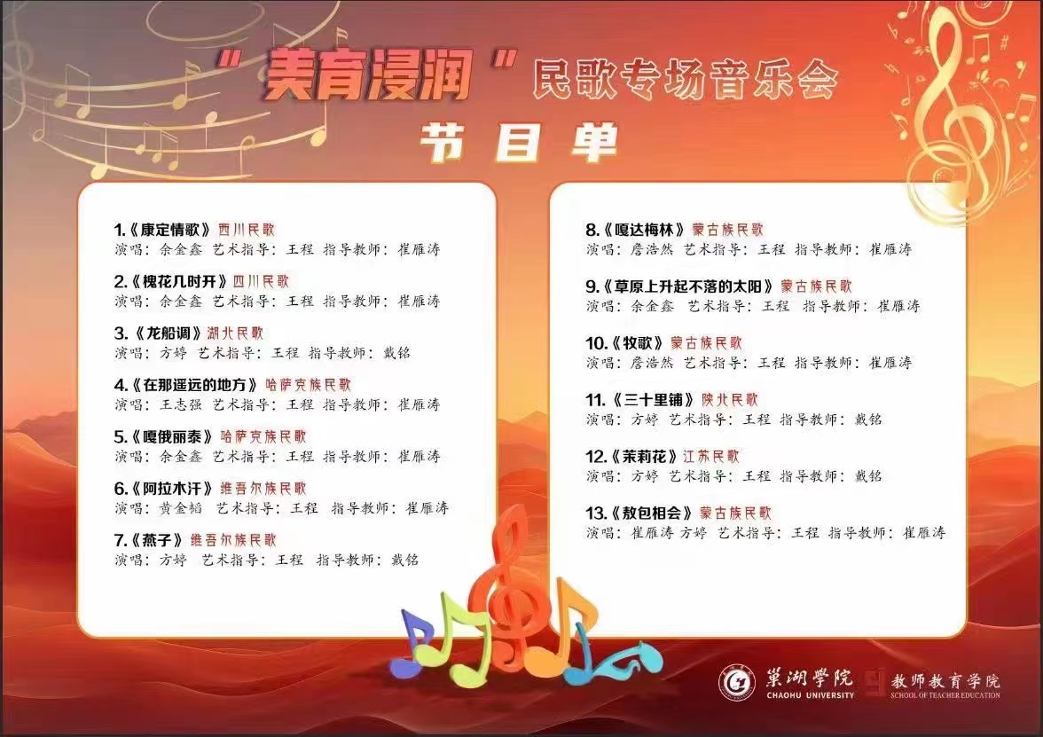 巢湖學院教師教育學院“巢湖民歌”一流課程團隊在藝術教育中心主任徐頻頻老師帶領下,團隊成員崔雁濤、劉傳行、郭華、戴銘、陳茜、周澤漢、孫定海、杜珊珊、朱冬梅、李穎、王佩琦等老師精心策劃,指導了此次巢湖民歌專場音樂會。此次音樂會,著力推進音樂表演專業建設與巢湖民歌傳承傳唱的有機結合,既為大家帶來了一場視聽盛宴,同時也為推動巢湖民歌的傳承發展貢獻了一份力量。