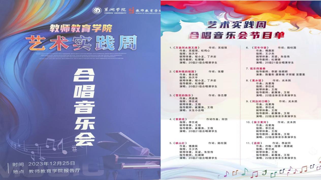 2024年1月2日晚,巢湖學院教育學院音樂表演專業在音樂報告廳成功舉辦了2020級音樂表演專業畢業匯演活動,包括獨奏、合唱、樂隊演奏等多個節目類型。展示了2020級音樂表演專業學子在大學四年所學、所感、所悟形成系列成果綜合呈現在舞臺上。