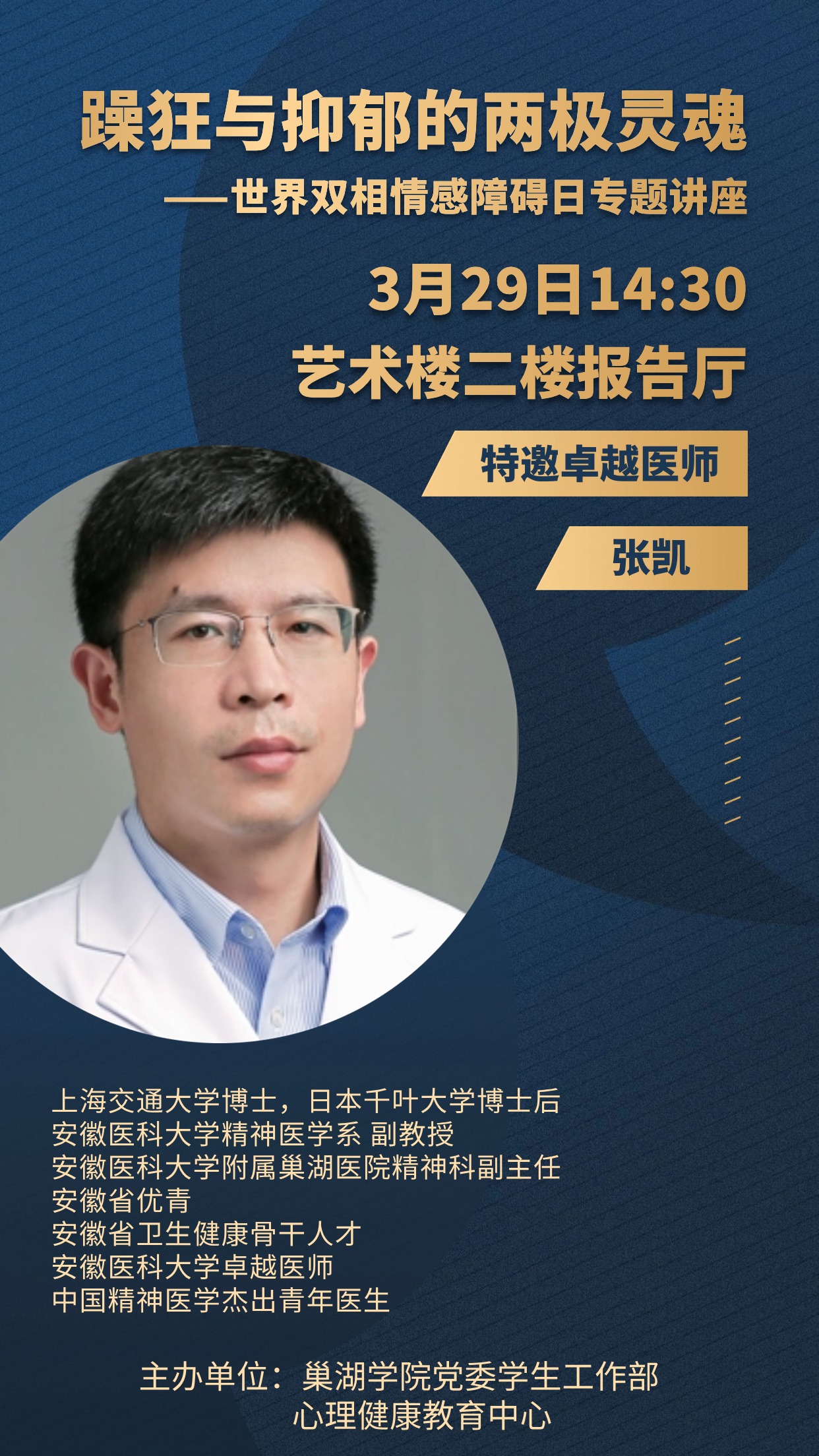 為了普及心理衛生知識,提升學生心理健康素養,正確認識雙相情感障礙,3月29日下午,我校心理健康教育中心特邀上海交通大學醫學院博士、日本千葉大學博士后、安徽醫科大學附屬巢湖醫院精神科副主任張凱,開展“躁狂與抑郁的兩極靈魂”世界雙相情感障礙日專題講座,本次講座由教師教育學院副院長、心理健康教育中心副主任鄭艷主持,百余名師生參加其中。