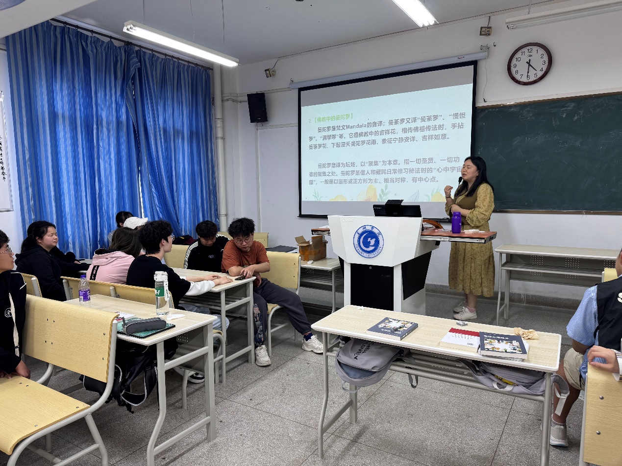 課程開始,袁蕙老師首先向同學們介紹了什么是曼陀羅繪畫,她深入淺出地講解了曼陀羅的起源、曼陀羅在人的心理活動中的作用、功能以及曼陀羅繪畫的作畫流程。她強調,曼陀羅繪畫不僅是一種藝術創作形式,更是一種獨特的心理治療手段,能夠幫助人們面對和排解負面情緒,促進心靈的健康成長。