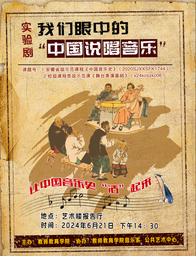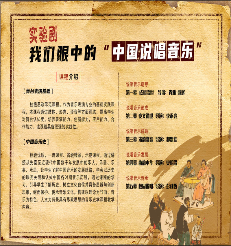 為了弘揚(yáng)中國(guó)文化,達(dá)到以德潤(rùn)身、以文化人、美育浸潤(rùn)。6月21日,教師教育學(xué)院音樂(lè)表演專(zhuān)業(yè)在藝術(shù)樓報(bào)告廳舉辦了一場(chǎng)以“我們眼中的中國(guó)說(shuō)唱音樂(lè)”為主題的中國(guó)音樂(lè)史說(shuō)唱音樂(lè)舞臺(tái)劇展演,此次展演由顧婷婷與戴銘兩位老師共同主持,也是首次嘗試將《中國(guó)音樂(lè)史》與《舞臺(tái)表演基礎(chǔ)》課程相結(jié)合,并邀請(qǐng)周澤漢老師到場(chǎng)參與指導(dǎo)。