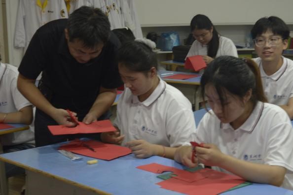 指尖落韻,妙“剪”生春。7月15日晚,實(shí)踐團(tuán)成員來到了巢湖市少年宮,拜訪了剪紙非遺傳承人胡順林老師,上了一堂“居巢剪紙”藝術(shù)課。在課堂上,胡老師向隊(duì)員們展示了自己的作品并進(jìn)行現(xiàn)場(chǎng)教學(xué),脫稿隨手剪出一只只蝴蝶。胡老師表示“最開始剪紙最主要的目的是為了賣錢補(bǔ)貼家用,自己一點(diǎn)一點(diǎn)去摸索,后來發(fā)現(xiàn)自己對(duì)剪紙非常熱愛,決定拜師學(xué)習(xí)好好把這剪紙學(xué)起來,傳下去。”一把剪刀、一張紅紙?jiān)诤蠋煹氖种凶兓鰺o數(shù)世界,以無聲的語言表達(dá)著一個(gè)又一個(gè)故事,讓實(shí)踐團(tuán)成員為之動(dòng)容。