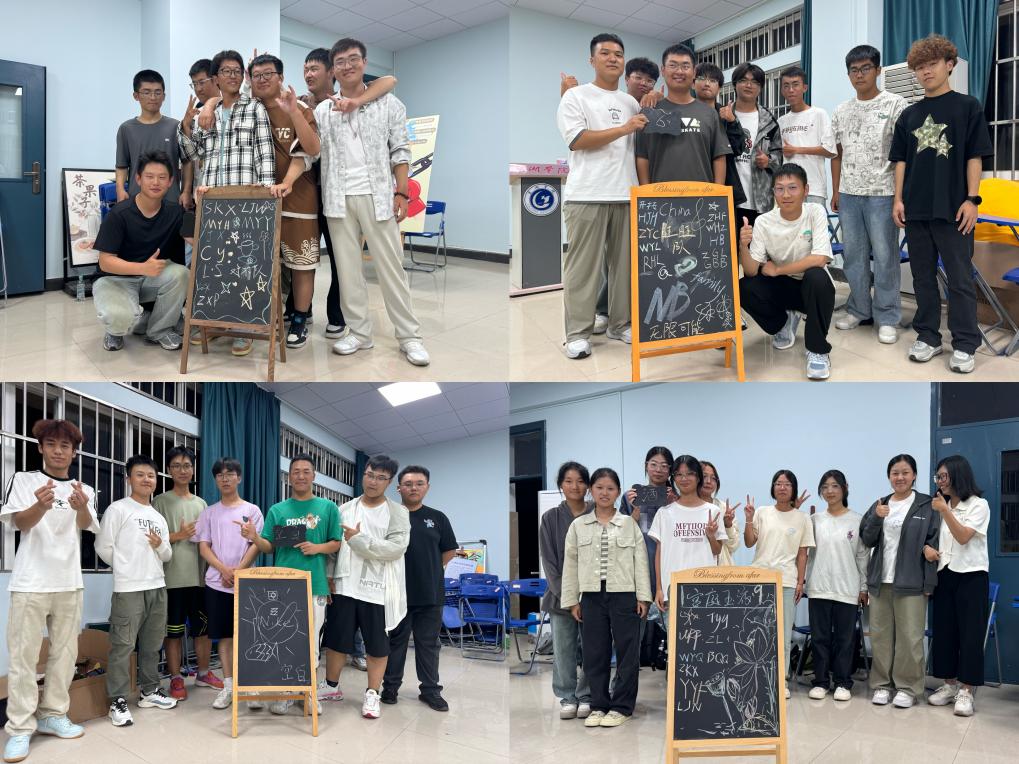 隨后,同學們簽署了團輔承諾書。接著,精彩的互動游戲輪番上演。在名字傳球環節,同學們依次介紹自己,傳遞“虛擬球”,氛圍輕松愉快。五毛一塊游戲中,大家根據口令快速分組,展現出良好的反應能力。we are family 環節,各團隊在黑板上設計隊名和團隊Logo,創意十足。蘿卜蹲游戲更是將活動氛圍推向高潮,各團隊成員圍成圈,以隊伍名稱為昵稱,在觀眾的擊掌節拍中緊張進行,隨著節拍加快,游戲難度不斷提升,且嚴格遵守不回傳規則。最后,同學們在便利貼上寫下對七次團體輔導活動的期待、提升目標以及下周的計劃和要做的事情,并貼在各自隊伍的黑板上。