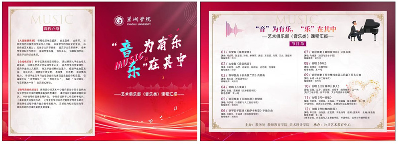 為踐行教育部《關(guān)于全面實施學(xué)校美育浸潤行動的通知》文件精神,展示巢湖學(xué)院公共藝術(shù)教育中心(音樂類)課程教學(xué)改革成果,12月18日晚,由教務(wù)處、教師教育學(xué)院、美術(shù)與設(shè)計學(xué)院共同主辦,公共藝術(shù)教育中心承辦的《“音”為有樂 “樂”在其中—公共藝術(shù)教育中心(音樂類)課程匯報演出》在藝術(shù)樓音樂報告廳成功舉辦。教務(wù)處副處長鄧方,教師教育學(xué)院黨政領(lǐng)導(dǎo)班子全體成員,美術(shù)與設(shè)計學(xué)院副院長(主持工作)李超峰,公共藝術(shù)教育中心副主任顧婷婷,團(tuán)委教師郭華,以及來自巢湖學(xué)院各學(xué)院百余名師生共同觀看了本次匯報演出。
