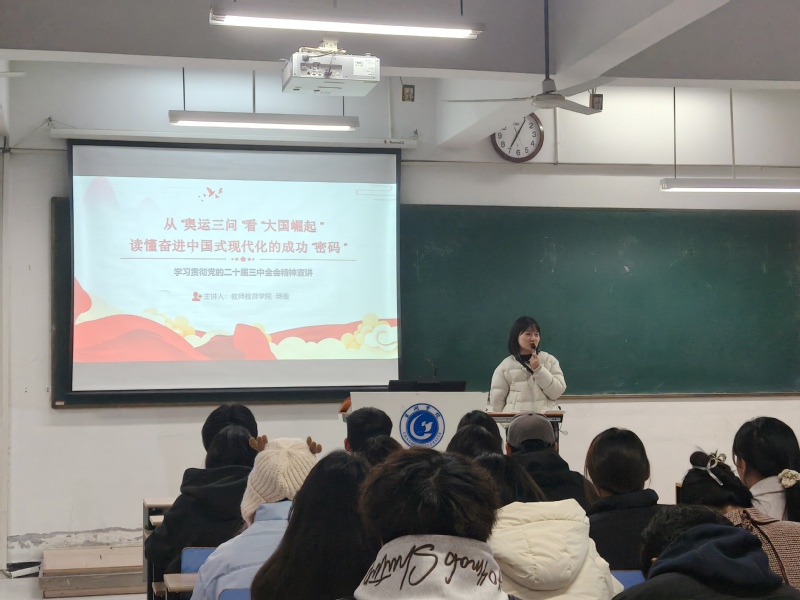 為深入學習宣傳貫徹黨的二十屆三中全會精神,加強青年學生思想政治引領,激勵同學們在學思踐悟中凝聚奮進力量,12月25日晚,教師教育學院在慎思樓中501教室開展學習貫徹黨的二十屆三中全會精神宣講,此次宣講會由學校學習貫徹黨的二十屆三中全會精神宣傳團成員湯重、汪旭、金雅雯主講,教師教育學院全體學生黨員、團學骨干參加。
