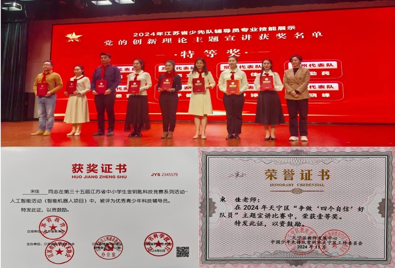 宋佳在2024年江蘇省少先隊輔導員專業技能展示活動的“黨的創新理論宣講”項目中獲得特等獎,并在頒獎活動中作為宣講項目中的唯一選手面向全省骨干輔導員作現場展示。