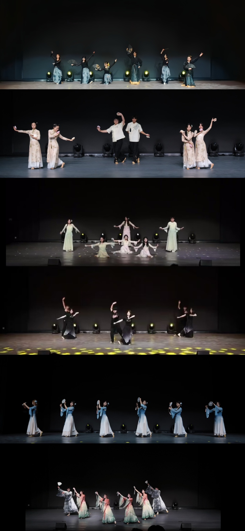 本次匯報演出由小組群舞、雙人舞和個人獨舞構(gòu)成。群舞《云裳羽衣曲》《簪花引》《予你人間》等展現(xiàn)古典舞姿之美與幼兒天真靈動相融合,男子獨舞串燒《嘆息亭》《一程山路》等以剛?cè)岵?jì)的動作,演繹少年仗劍天涯的詩意想象;獨舞《青花瓷》《煙雨江南》婉約舞姿,傳遞水墨丹青中的詩意童趣,《西樓別序》,到敦煌元素的創(chuàng)意編排,同學(xué)們深挖傳統(tǒng)文化符號,將古典舞身韻、民族舞風(fēng)格融入學(xué)前教育場景,巧妙運用道具,如扇子、傘等等,為舞蹈增添了豐富的視覺效果。每一個精心設(shè)計的隊形變換、每一段富有感染力的舞蹈動作,都凝聚著同學(xué)們的智慧與汗水。從構(gòu)思創(chuàng)意到編排動作,從服裝搭配到舞臺呈現(xiàn),大家都全力以赴,力求將最完美的表演展現(xiàn)給觀眾。