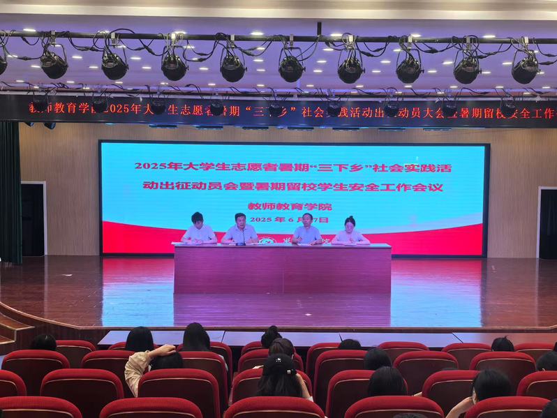 6月27日上午,教師教育學院在藝術樓報告廳召開2025年大學生暑期“三下鄉”社會實踐出征動員會暨暑期留校學生安全工作會議。學院黨委副書記胡傳雙、左勁中,全體輔導員、社會實踐團隊指導教師、實踐隊員及暑期留校學生參加會議。會議由左勁中主持。