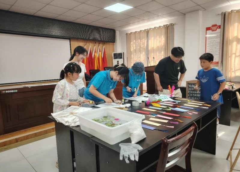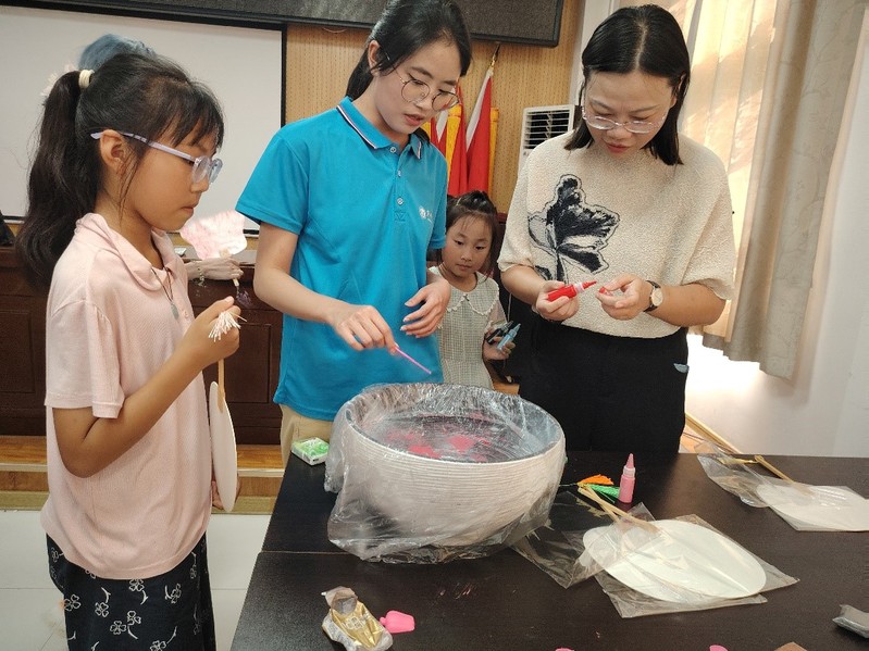 7月6日,實踐團在銀屏鎮舉辦了“拾趣非遺”藝術游園會,活動共設置了七個子活動,分為德育區、智育區、體育區和美育區。在德育區,孩子們在“巧手百捶坊”親手制作養生錘,體驗傳統手工藝的樂趣;在智育區,“古韻拓春秋”和“燈謎解心齋”吸引了眾多孩子參與,他們拓印古老紋樣,破解趣味燈謎,在傳統文化的熏陶中鍛煉思維;體育區的“飛羽貫壺亭”和“毽舞風云擂”熱鬧非凡,孩子們體驗古人投壺的雅趣,或是加入踢毽子的歡樂比拼,現場歡聲笑語不斷;美育區的“流螢點扇閣”和“摶土幻形館”則是藝術愛好者的天堂,孩子們親手繪制漆扇,捏制泥人,讓普通的材料在巧手下變成獨一無二的藝術品。游園會現場氣氛熱烈,孩子們在體驗中感受美育的樂趣,增強了對傳統文化的興趣和熱愛。