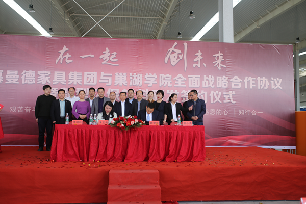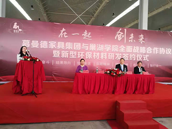 4月29日下午,巢湖學院與慕曼德家具集團全面戰略合作協議暨新型環保材料研發簽約儀式在安徽慕曼德環保家具產業園隆重舉行。校黨委委員、副校長朱定秀,含山縣人民政府副縣長、含山經濟開發區管理委員會主任裴小勇,慕曼德家具集團總經理賴俊良出席儀式并致辭。科技處處長萬新軍、化學與材料工程學院院長李明玲、藝術學院副院長褚春元等參加簽約儀式。