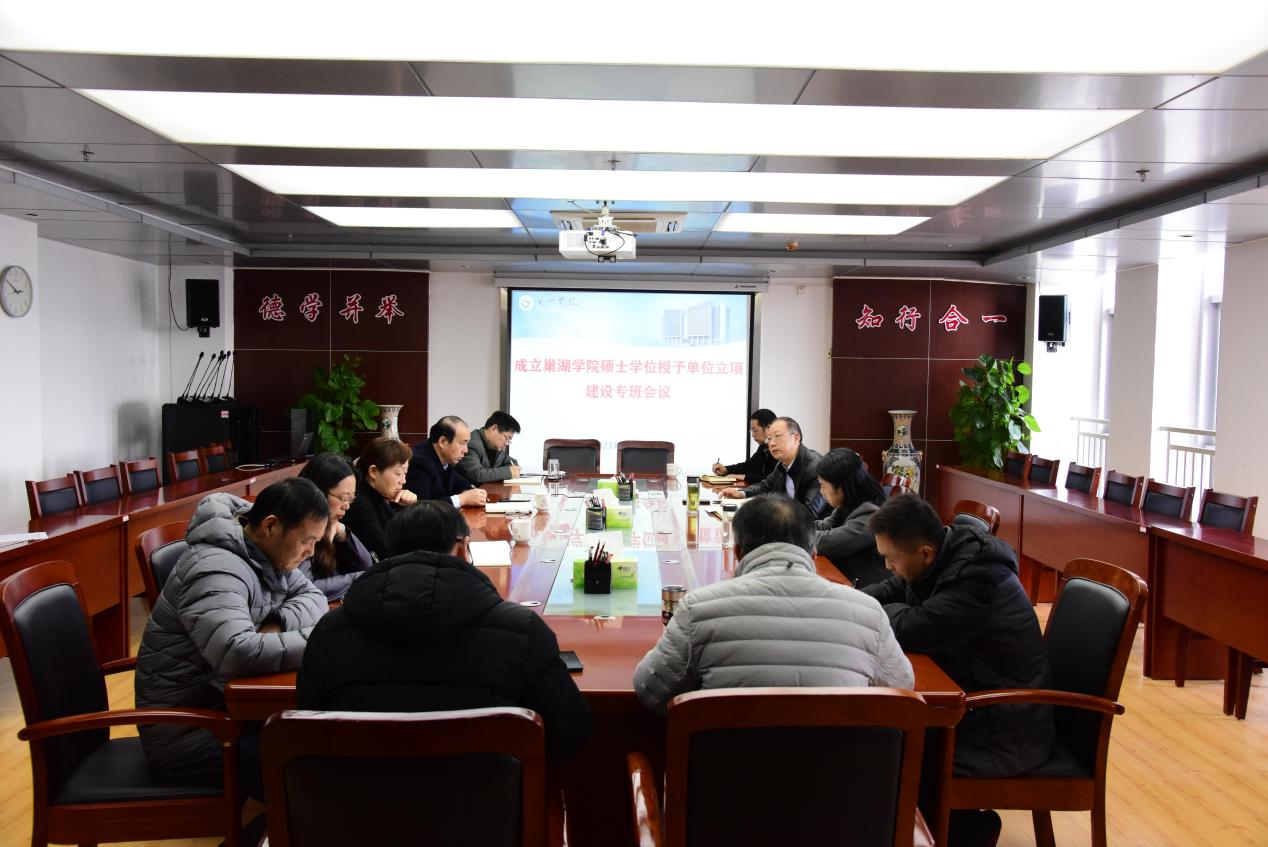 11月25日下午,巢湖學(xué)院碩士學(xué)位授予單位立項(xiàng)建設(shè)工作專班成立會(huì)議在校第一會(huì)議室召開。校長祝家貴、副校長朱定秀出席會(huì)議。校黨政辦公室、黨委教師工作部、發(fā)展規(guī)劃處、教務(wù)處、科技處、財(cái)務(wù)處、后勤管理與基建處以及體育學(xué)院、化學(xué)與材料工程學(xué)院等單位主要負(fù)責(zé)同志和相關(guān)人員參加了會(huì)議,會(huì)議由祝家貴主持。