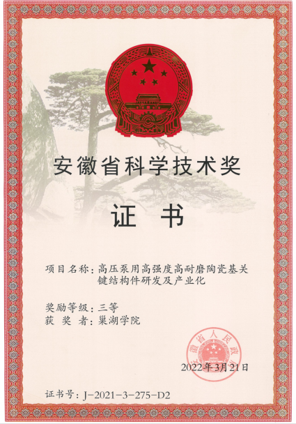 近日,安徽省科學技術獎勵大會在合肥隆重召開,會上對2021年度為我省科學技術進步、經濟社會發展作出突出貢獻的科學技術人員和組織進行表彰。巢湖學院化學與材料工程學院徐小勇、許小兵、張揚科研團隊主持完成的“高壓泵用高強度高耐磨陶瓷基關鍵結構件研發及產業化”獲安徽省科學技術獎三等獎。