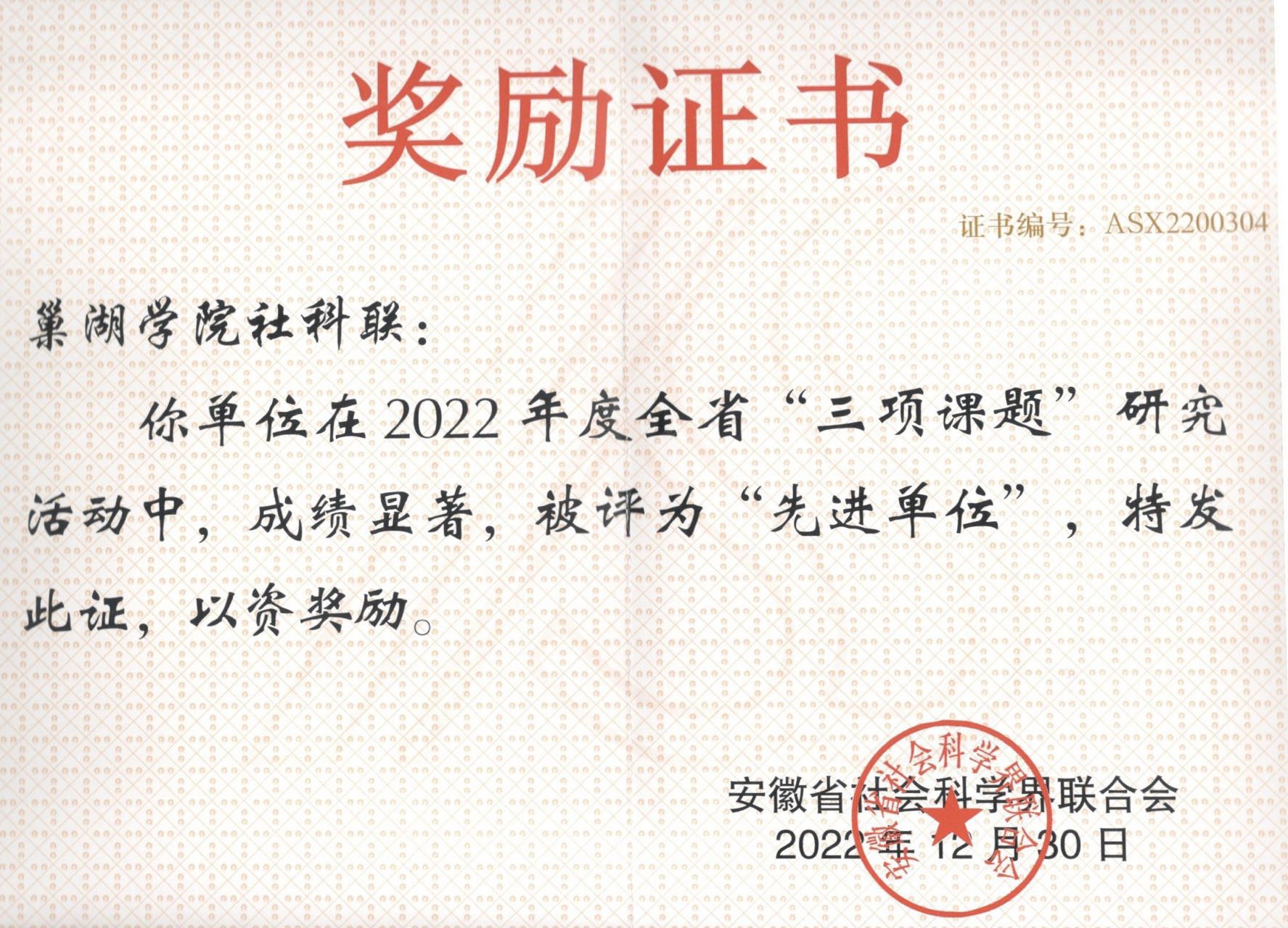 會議聽取并審議了省社科聯工作報告,并對2022年度全省“三項課題”研究優秀成果及先進單位進行了頒獎。巢湖學院6項成果獲得2022年度全省“三項課題”研究優秀成果,其中旅游管理學院齊先文、李曉萌撰寫的《長三角一體化背景下安徽省鄉村旅游發展戰略研究》和外國語學院李吟撰寫的《習近平北外回信背景下外國文學教育創新路徑研究》獲得一等獎,旅游管理學院張安東撰寫的《學習貫徹黨的二十大精神 增強實現鄉村振興的精神力量》、雷若欣撰寫的《“長三角閱讀馬拉松”賽事的品牌化運作與實踐》和經濟與法學學院穆瀾撰寫的《金融發展、科技創新與經濟高質量》獲得二等獎,美術與設計學院李超峰撰寫的《論當代安徽油畫風景對徽州視覺圖像的繼承與創新》獲得三等獎。因成績顯著,校社科聯獲評2022年度全省“三項課題”研究活動“先進單位”稱號(全省高校社科聯僅有9家獲此殊榮,校社科聯綜合排名第6)。(文、圖/王麗娟 部門審核/姚磊 終審/張連福)