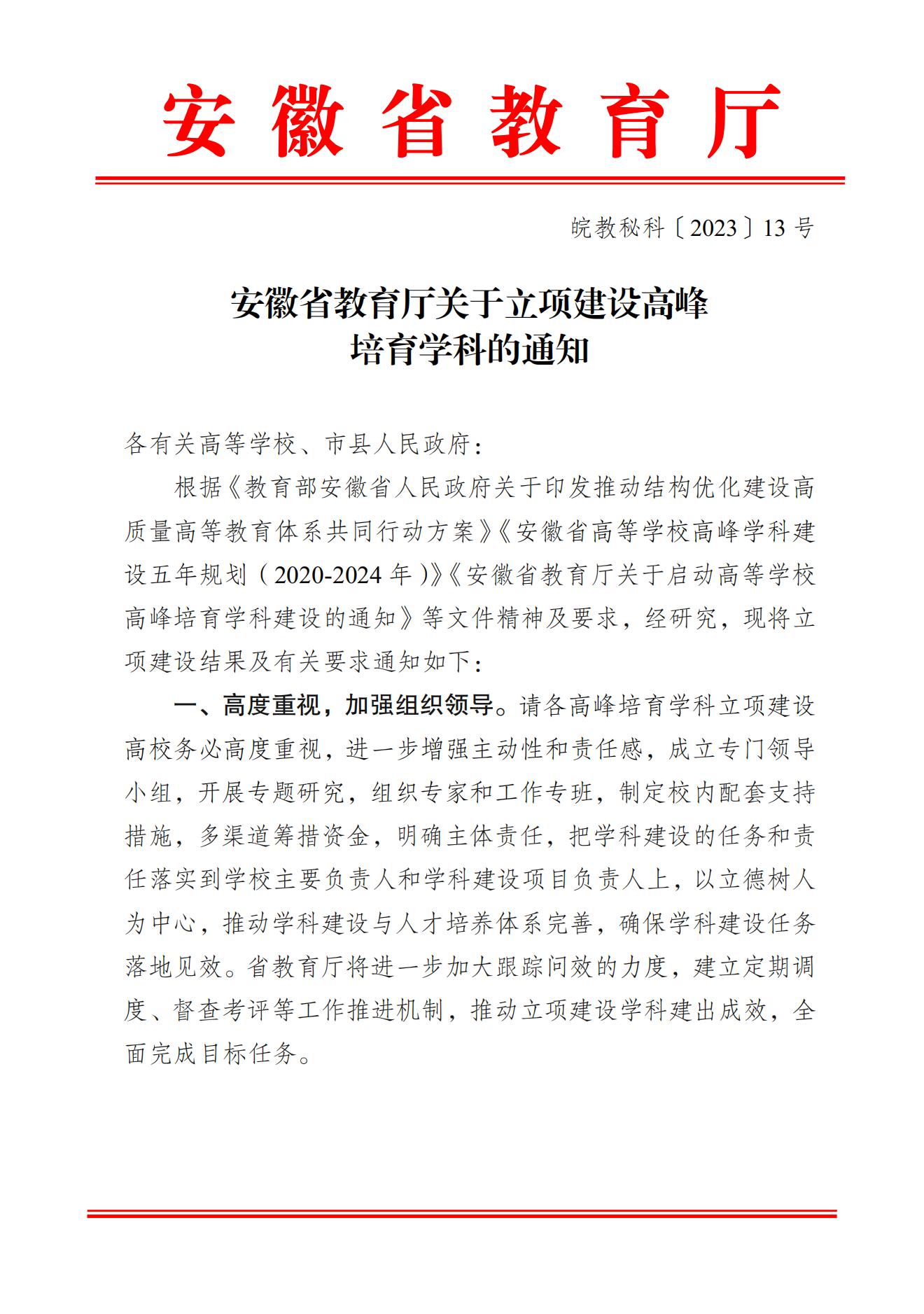 皖教秘科〔2023〕13號 安徽省教育廳關于立項建設高峰培育學科的通知.pdf