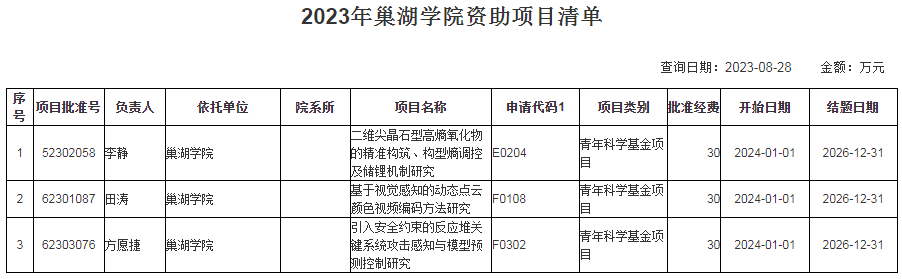 近日,國家自然科學(xué)基金委員會(huì)公布2023年國家自然科學(xué)基金集中接收申請(qǐng)項(xiàng)目評(píng)審結(jié)果,巢湖學(xué)院獲批國家自然科學(xué)基金青年項(xiàng)目3項(xiàng),直接經(jīng)費(fèi)90萬元,獲批項(xiàng)目數(shù)創(chuàng)歷史新高。