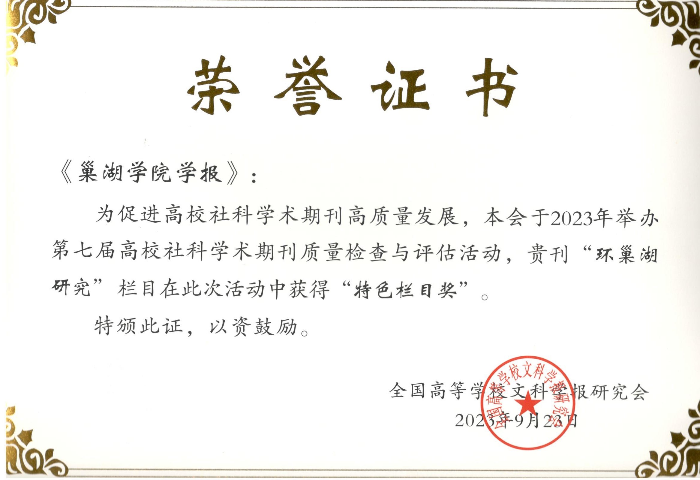 2023年9月23日,全國高等學校文科學報研究會九屆三次理事會暨編輯業務培訓會在湖北宜昌三峽大學舉行,來自全國高校期刊界的近700名代表參會。會上,全國高等學校文科學報研究會公布了第七屆高校社科學術期刊質量檢查與評估結果,對獲獎的優秀期刊、優秀欄目和優秀個人進行了表彰,《巢湖學院學報》“環巢湖研究”特色欄目榮獲“特色欄目獎”。