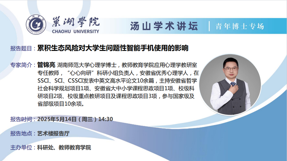 湯山學術講壇青年博士專場第7講:(5月14日:教師教育學院管錦亮博士講座)