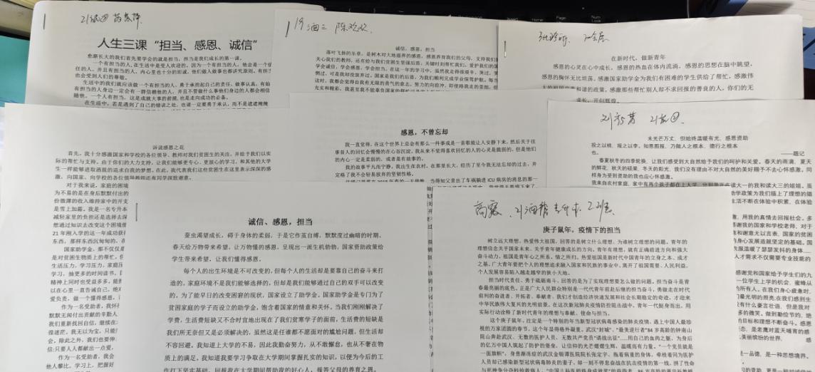 為了解受助學生內心的想法,增強資助育人的實際成效,學院組織了以“誠信 感恩擔當”為主題的征文比賽,受助學生積極報名參加征文活動,累計收到參賽作品117件。大家用文字表達對資助政策的感激、對誠信的認識,以及自己立志成才的決心。經過評選,《感恩,不曾忘卻》《在新時代,做新青年》《庚子鼠年,疫情下的擔當》等8篇文章選為優秀征文。