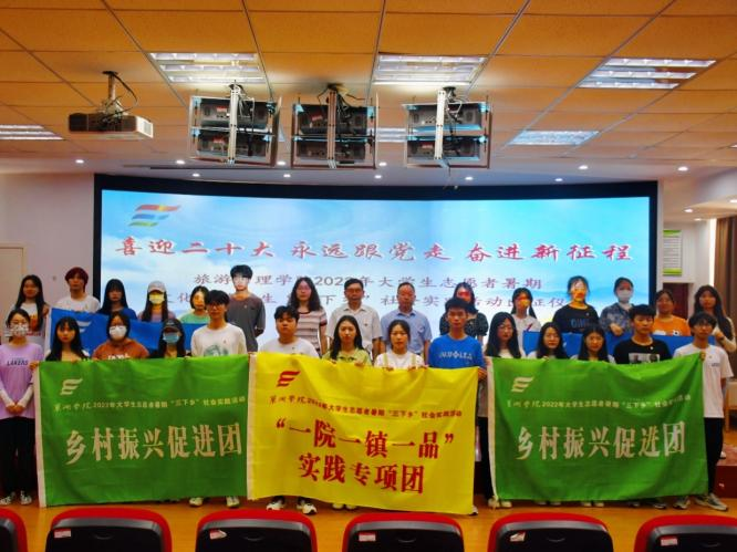“喜迎二十大 永遠跟黨走奮進新征程”,深入學習貫徹習近平新時代中國特色社會主義思想和黨的十九屆六中全會精神,引導學生上好與現實相結合的“大思政課”,在社會課堂中“受教育、長才干、作貢獻”,深化學院“三全育人”改革,扎實推進“五育并舉”,6月15日上午,旅游管理學院在3D實訓室舉行2022年大學生志愿者暑期“三下鄉”社會實踐出征儀式。院黨委書記董金山、黨委副書記夏桂林、指導教師代表馬其霞及志愿者代表參加。儀式由學院團總支負責人孫圓圓主持。