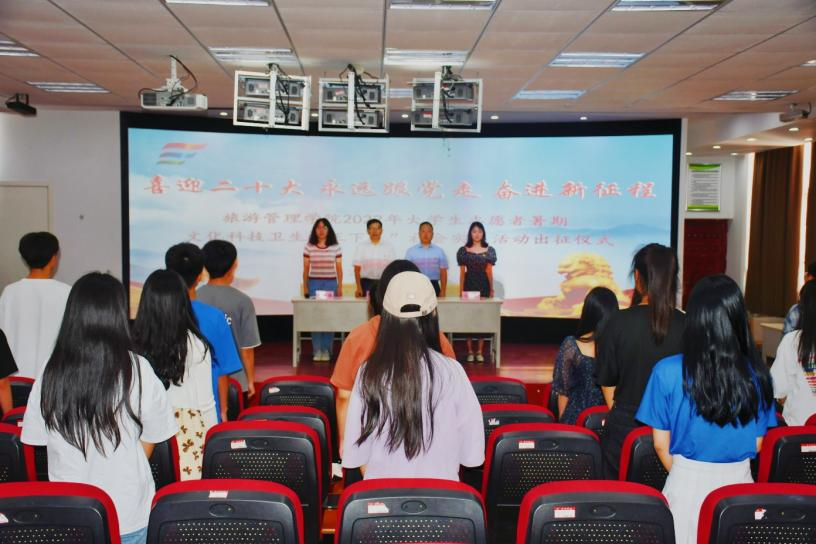 在激昂的國歌聲中儀式拉開帷幕。董金山宣布旅游管理學院2022年大學生志愿者暑期“三下鄉”社會實踐活動正式啟動。夏桂林在講話中強調,希望各團隊緊扣活動主題,以“了解社會、服務社會”為主要內容,深入基層、深入群眾、深入實踐,在社會這個“大課堂”中接受再教育,真抓實干,務求實效,圓滿完成各項目標任務,并就活動開展提出幾點要求:一是突出主題。聚焦深入學習習近平新時代中國特色社會主義思想,堅決把牢正確政治方向;二是提高認識。暑期社會實踐是一次深入基層,體察社情民意,學以致用、學用結合的難得機會,不能走馬觀花、不能浮于表面;三是加強宣傳。大家要將在觀察上和認識上的積累、在實踐和調研中的好的做法、好的人物和好的故事等提煉總結,轉化為富有意義、內容生動的宣傳產品;四是務求實效。活動開展時間緊湊,大家要根據活動主題和內容,合理設計好時間表、任務圖,根據時間節點,完成既定目標任務;五是提高安全意識。提高安全防范意識和團隊意識,服從指導老師指揮,保持通訊暢通,確保活動安全順利進行。