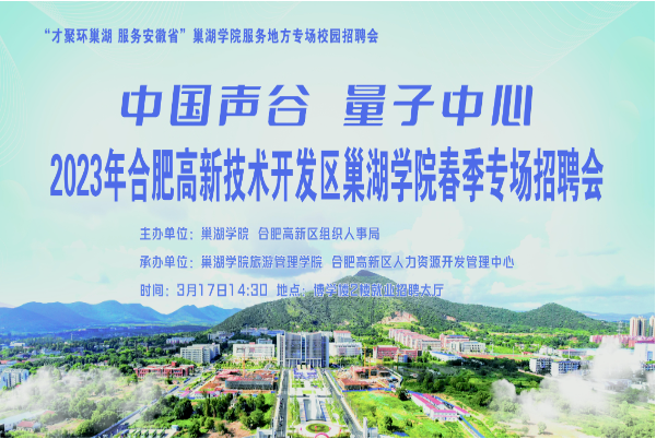 為扎實推進春季促就業攻堅行動要求和部署,推動用人企業和畢業生精準對接,3月17日下午,由合肥高新技術開發區管委會、巢湖學院主辦,旅游管理學院等承辦的2023年合肥高新技術開發區巢湖學院春季專場招聘會在博學樓二樓就業大廳成功舉辦。
