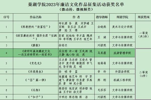 據悉,本次活動,學校共收到500余件作品,其中微動漫、微視頻類共評選出一等獎3件,二等獎6件,三等獎10件。旅游學院高度重視黨風廉政建設工作,充分挖掘環巢湖地區豐富的廉政文化元素,主動利用好環巢湖文化展館等育人資源,積極營造崇廉拒腐良好環境。(文、圖/馬其霞 初審/鄧其志 終審/洪作奎)