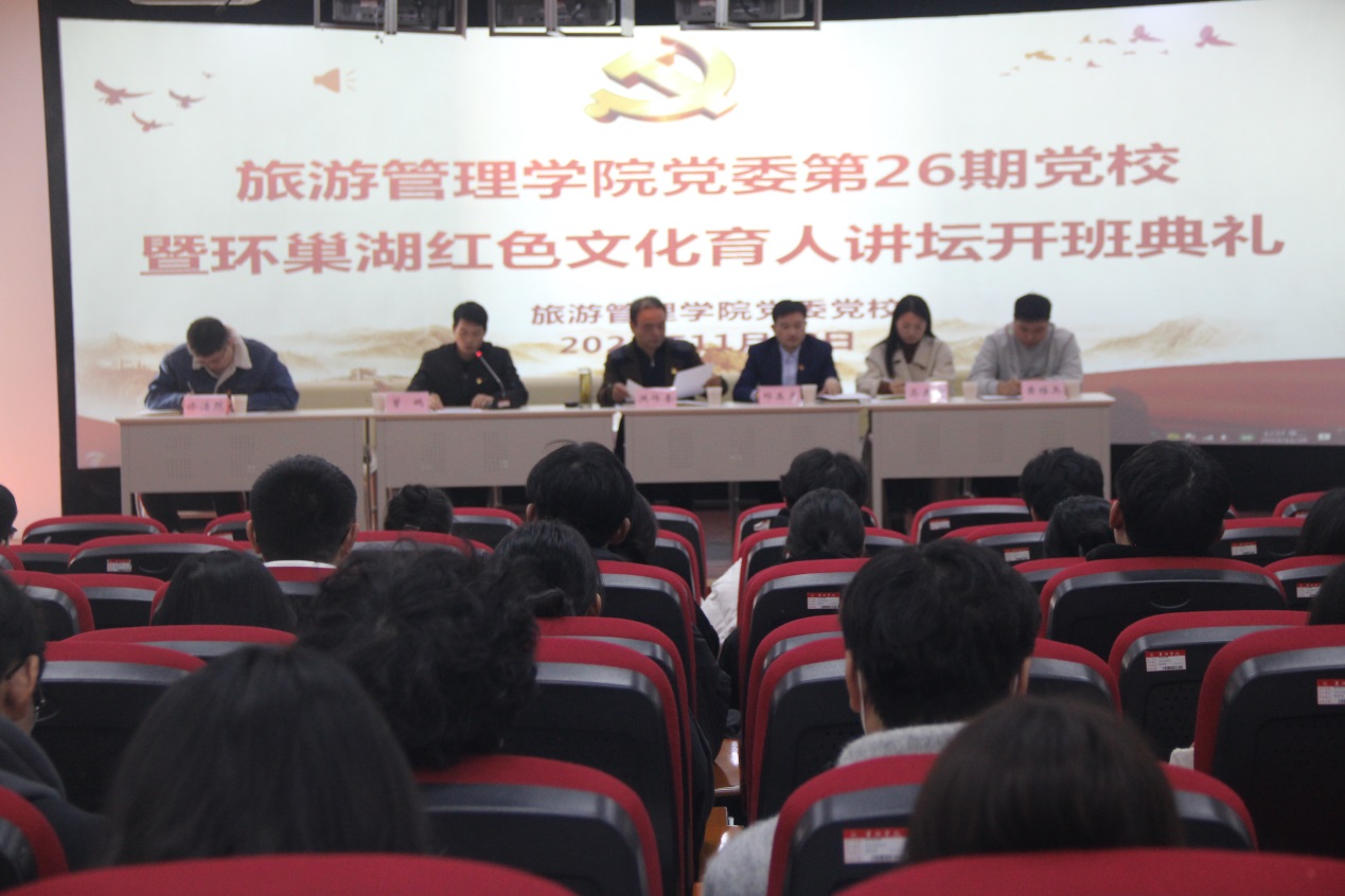 11月28日,旅游管理學院黨委第26期黨校暨環巢湖紅色文化育人講壇隆重開班。學院黨委書記洪作奎、黨委副書記、紀委書記鄧其志、學生支部書記馬其霞、黃維兵、團委副書記徐浩然出席典禮,發展對象和入黨積極分子參加開班儀式。開班典禮由黨校班主任曾鵬主持。