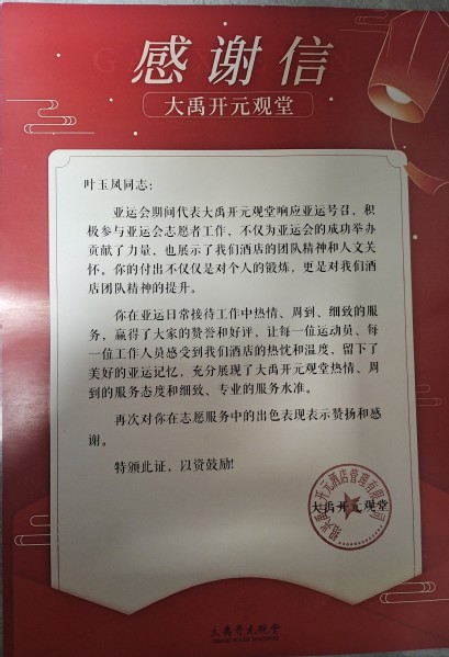 近日,旅游管理學院學子葉玉鳳同學收到浙江紹興大禹開元觀堂酒店發來的感謝信,表揚其在杭州亞運會志愿服務期間的出色表現。