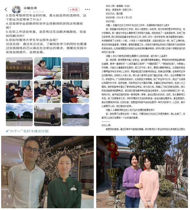 訪談生涯人物。訪談生涯人物,是一種了解他人經(jīng)驗、尋找智慧的方式。旅游學院組織學生利用寒假假期,通過社會兼職、探親訪友等多種形式,近距離與身邊的朋輩榜樣接觸,虛心請教,了解專業(yè)、行業(yè)、職業(yè)等相關前景,幫助自己明晰生涯規(guī)劃,樹立明確目標。