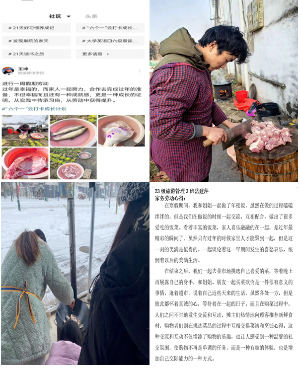 參與假期勞動。假期中,旅游學院100余名畢業(yè)班學子在各大文旅單位進行實習實踐,其他年級學生或主動承擔家務,或參與假期兼職,或參與志愿服務活動,通過多種方式參與勞動教育,不僅培養(yǎng)了責任感,還增進了家庭關系,增添新年氛圍。