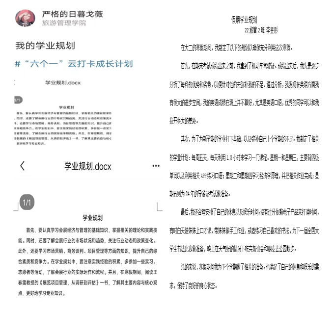制定學業(yè)規(guī)劃。大學時期是人生學習的重要階段,旅游學院注重加強對學生的學業(yè)規(guī)劃。假期中,各班級學生積極了解專業(yè)發(fā)展動態(tài)和前景,提高專業(yè)認知水平,定制寒假短期目標,制定適合自己的學業(yè)規(guī)劃,暢想大學生活。