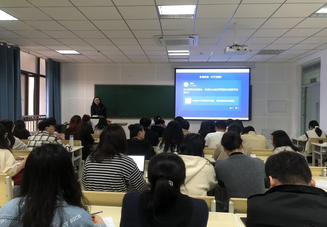 本次教學(xué)觀摩課由學(xué)校第十二屆青年教師教學(xué)基本功競(jìng)賽文科組一等獎(jiǎng)獲得者、教工二支部黨員曹睿老師主講,主講課程為《參展實(shí)務(wù)》。曹睿老師以“上海寶馬冰淇淋事件”為導(dǎo)入,分析了展臺(tái)工作人員應(yīng)具備的知識(shí)和能力。曹睿老師教學(xué)儀態(tài)大方自然、教學(xué)過程流暢、思路清晰,并且綜合運(yùn)用了案例分析、小組討論、智慧教學(xué)等多種教學(xué)方法,課堂氣氛活躍,教學(xué)效果良好。